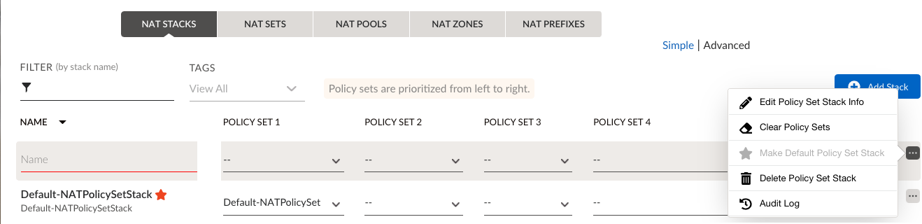 A simple NAT stack has only one NAT policy set. The NAT policy set has the same name as the NAT Stack. You can add NAT Policy rules directly to Simple NAT Policy Set Stacks. This simplifies the management of NAT stacks if you do not need to leverage the stacking capabilities.