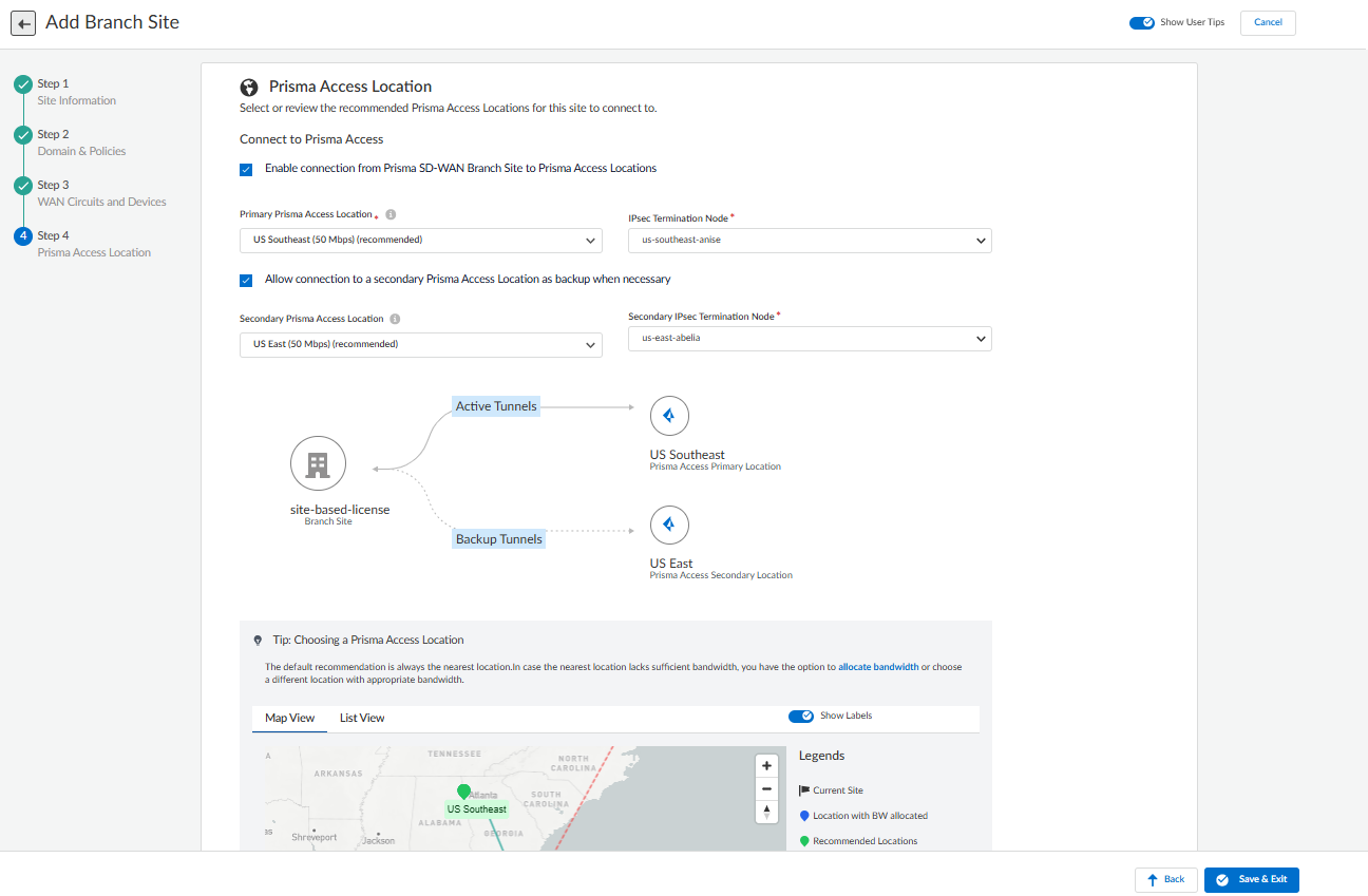 On Step 4 Prisma Access Location, select a Prisma Access Location for this site to connect to.For Aggregate bandwidth: