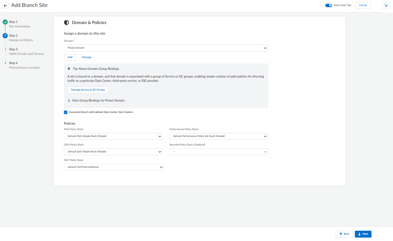 On Step 2 Domain & Policies, select a Domain from the drop-down. Or Add a Domain or Manage a Domain.By default, a preset domain is displayed for a branch site.