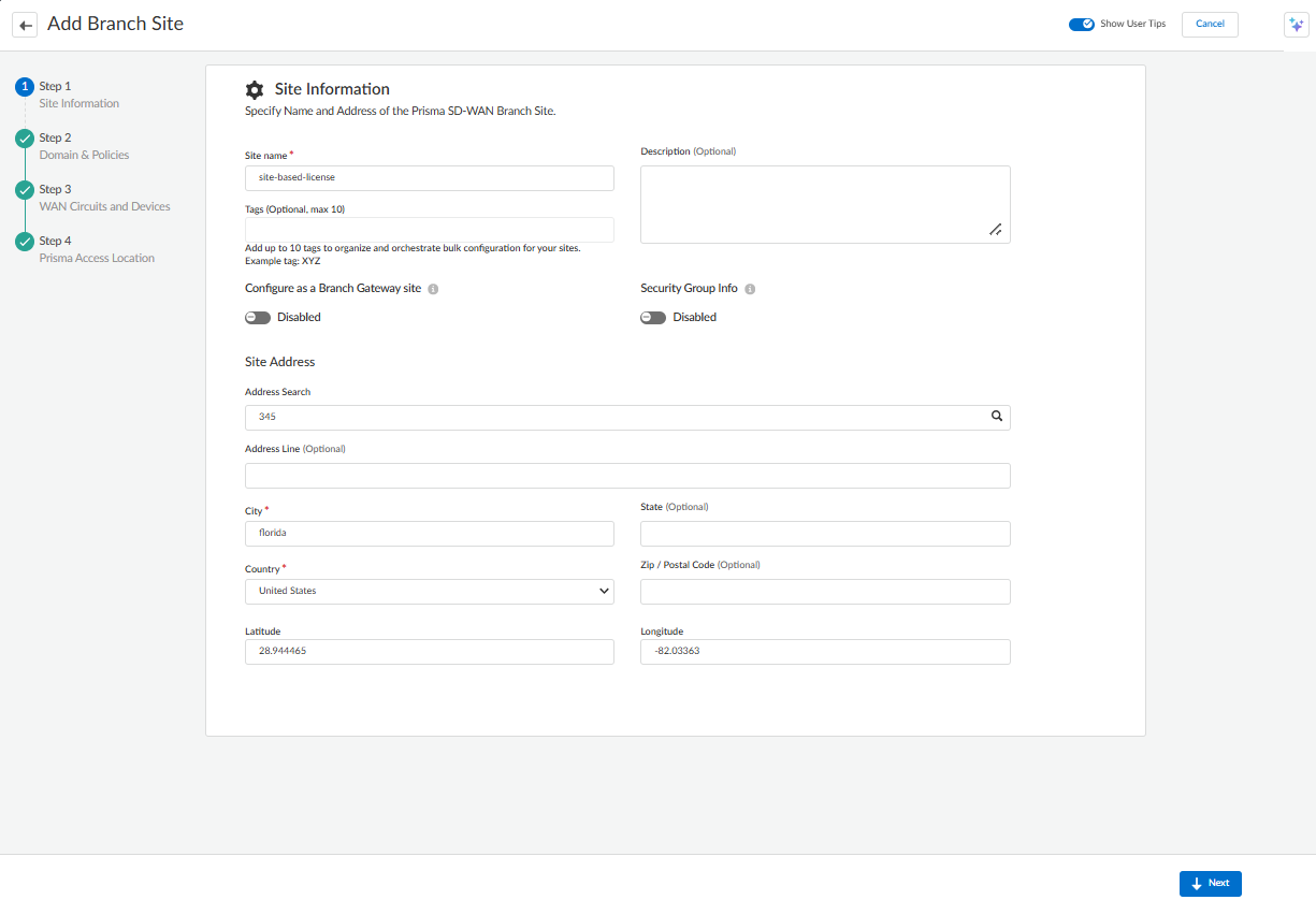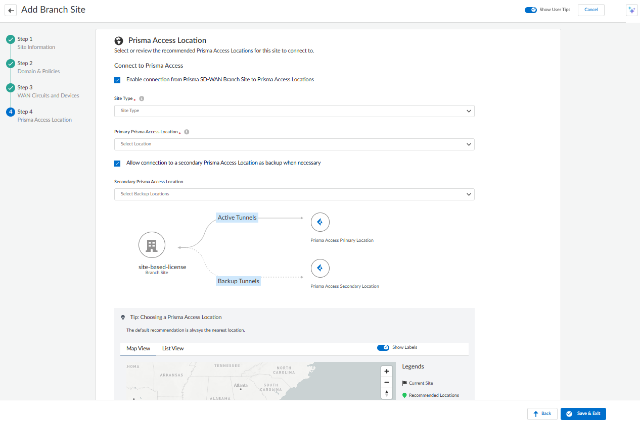 location, to automatically configure BGP and tunnels.You can uncheck the box to create a site without connecting to the Prisma Access remote network. However, you can add the Prisma Access connection later from the Branch Sites page by selecting the Connect to Prisma Access option.
