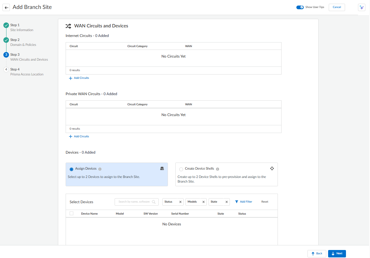 - On the Devices tab, select Assign Devices, select from the available devices to assign or Create Device Shells to create up to two Device Shells to preprovision and assign to the Data Center site, depending on your requirement.
