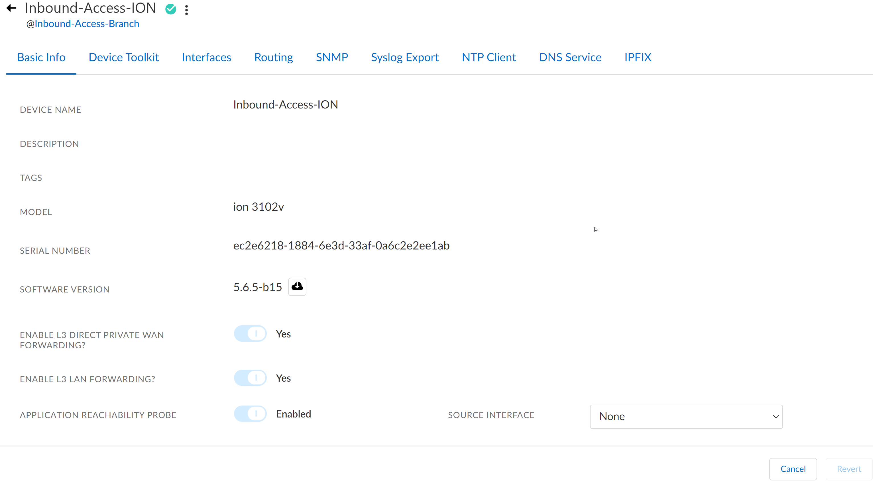 - Select ConfigurationPrisma SD-WANION DevicesClaimed and select the device you wish to configure.From the ellipsis menu, select Configure the device.The device configuration screen displays.On the Basic Info screen, enter a name and an (optional) description for the device.The ION device model, redundancy mode, serial number, and software version display automatically.