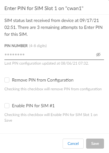 The check box Remove PIN from Configuration is deselected by default. When deselected, the PIN is used to secure the SIM. You cannot use the SIM until the SIM PIN is configured.Enable PIN for SIM#1 to enable the PIN for the selected slot.Save to save the configuration.