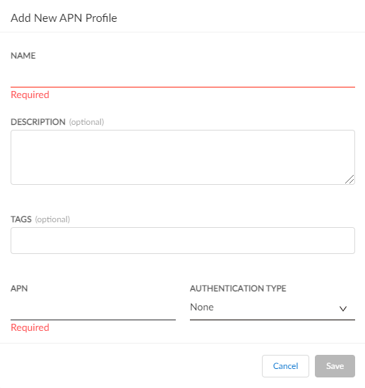 (Optional ) Add a Description and Tags for the profile.Enter the APN details.Based on the SIM, you may need to configure a specific APN to get the cellular connection up and maintain different APNs. Contact your cellular carrier for support.Select the Authentication Type.Select from the available options PAP, CHAP, or PAP/CHAP.(Optional) Configure the User name and Password given by the cellular carrier.Save the changes.