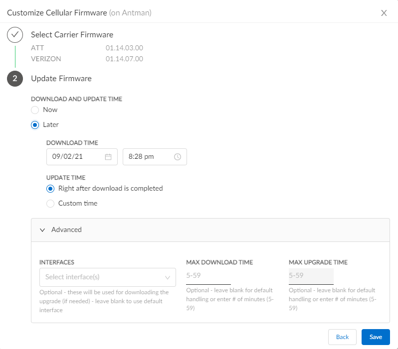 Select Carrier Firmware and the corresponding version and click Next.You can select a maximum of two firmwares files which are loaded on to the modem. Inactive firmware are stored on the ION device.To delete an existing firmware, click the delete icon against the firmware file.For Download and Update Time select whether you want to update the selected firmware Now or Later.If you selected Later, select the Download Time and Update Time.You can choose Custom time option to update the firmware.(Optional) Configure the Advanced settings.- Leave the Interfaces blank to use the default setting.