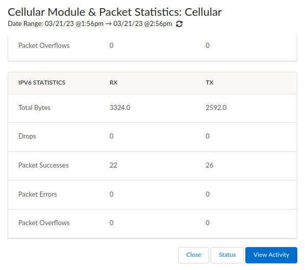 Cellular Module and Packet Statistics screen; you can view the V4 and V6 Packet