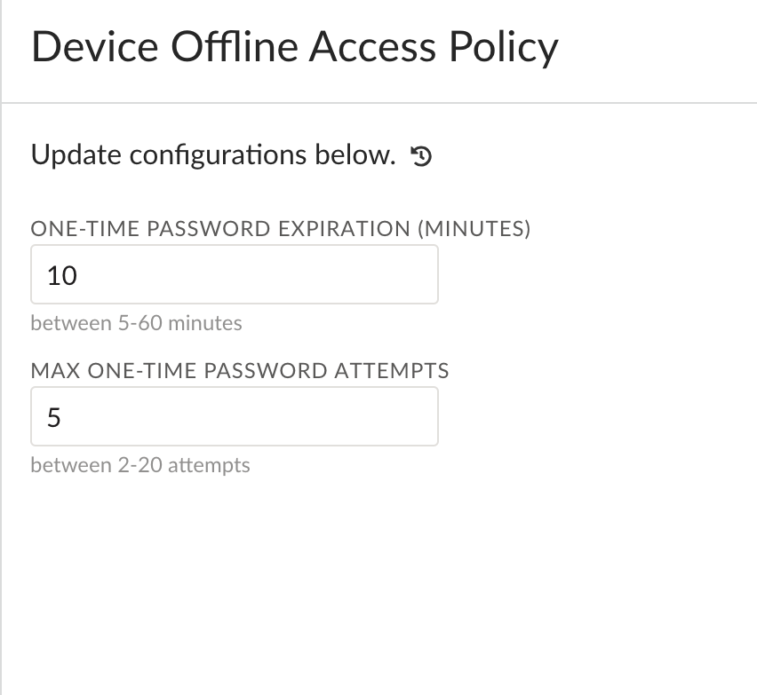• You can modify the maximum number of one-time password attempts and expiration timeframes from ConfigurationPrisma SD-WANSystemDevice Offline Access on the Prisma SD-WAN web interface.