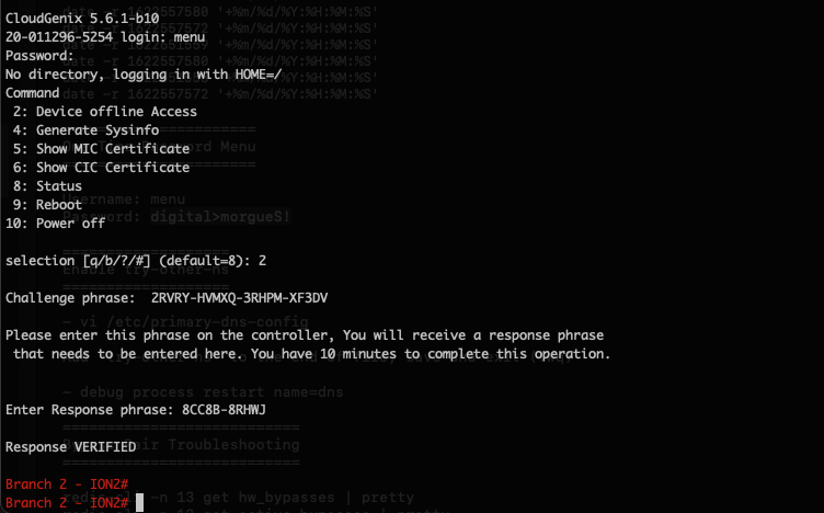 1. At the console of the remote, offline device, log in with menu as the username and digital>morgueS! as the password.