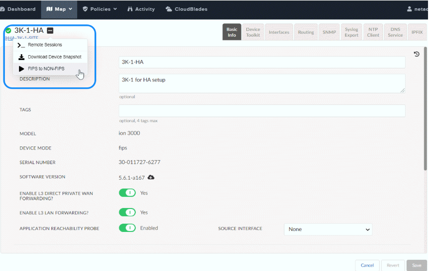 With Prisma SD-WAN release 5.6.1, you can switch between FIPS and non-FIPS modes. You can change the mode on the Prisma SD-WAN Controller. The ION device has to be either in the Claimed or Assigned state. If the mode change is done in the claimed state, the device comes back in the claimed state, and if changed in the assigned state, it comes back in the assigned state.