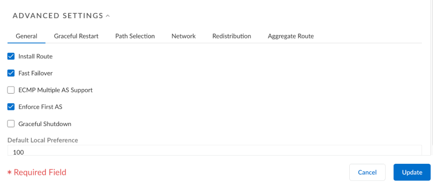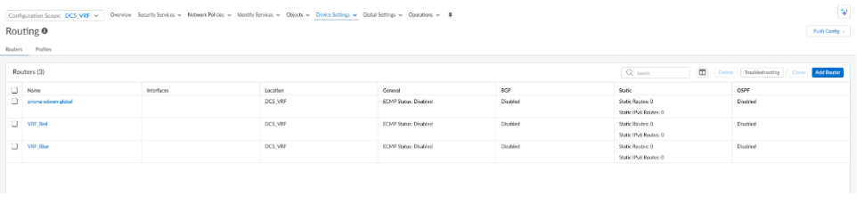 Configure the logical routers (VRF_Red and VRF_Blue) on the NGFW.- Configure these logical routers with core peer details by navigating to NGFW and Prisma AccessOverviewDevice SettingsRouters.