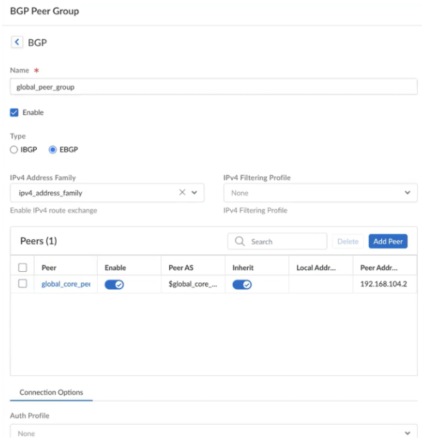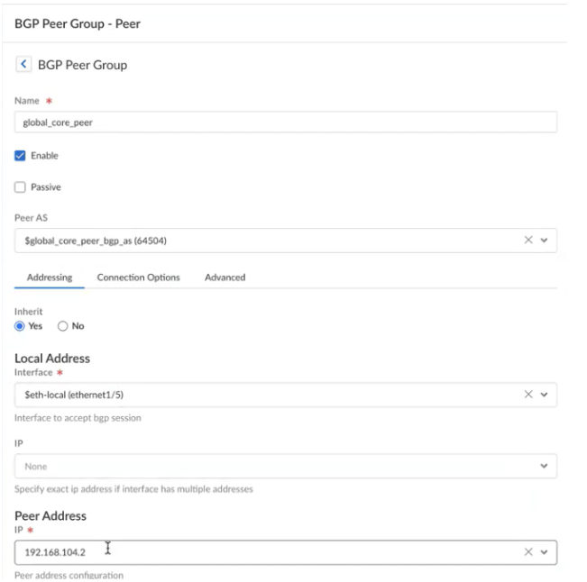 - Enable BGP. Add the Router ID and Local AS using the defined variables.