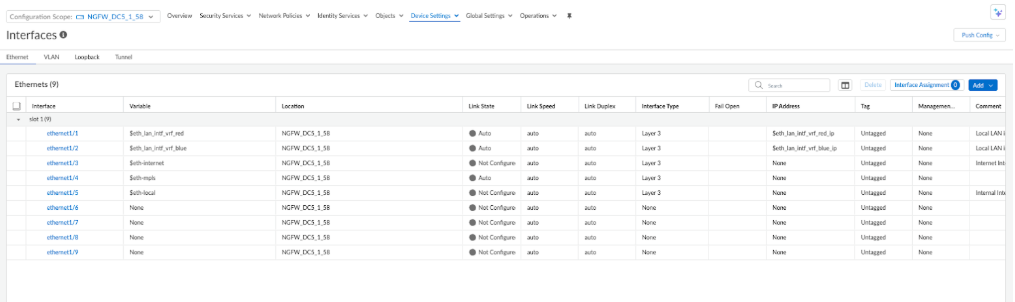 Configure the required LAN and WAN interfaces on the NGFW using the variables created earlier.- Add Ethernet interfaces and assign IP addresses.