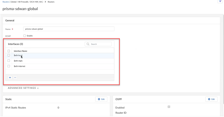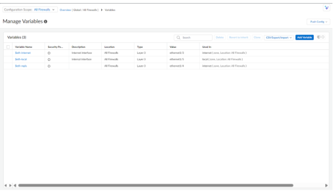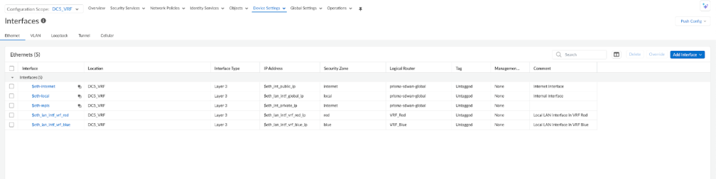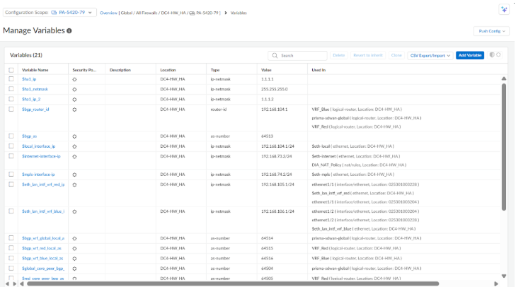 Enable Prisma SD-WAN on the NGFW and push the initial configuration.Create necessary variables at the NGFW folder level for public, private, and LAN interfaces, their IP addresses and gateways, BGP router ID, and local and peer BGP as numbers for Global, Red, and Blue VRFs.- Add variables by accessing Overview Variables.