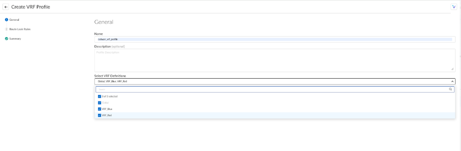 - Add new VRF definitions, such as VRF_Blue and VRF_Red. Global VRF is present by default.
