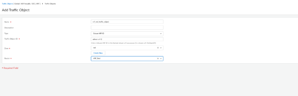 - Create Traffic Objects that map the created logical routers (VRF_Red, VRF_Blue) with the corresponding security zones (red, blue).