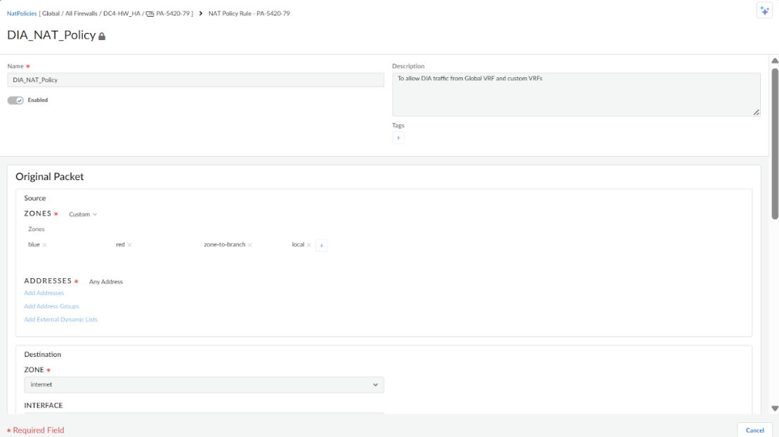 At the NGFW folder level, configure the NAT policy for Direct Internet Access (DIA) traffic originating from specific zones.Direct Internet Access Configuration