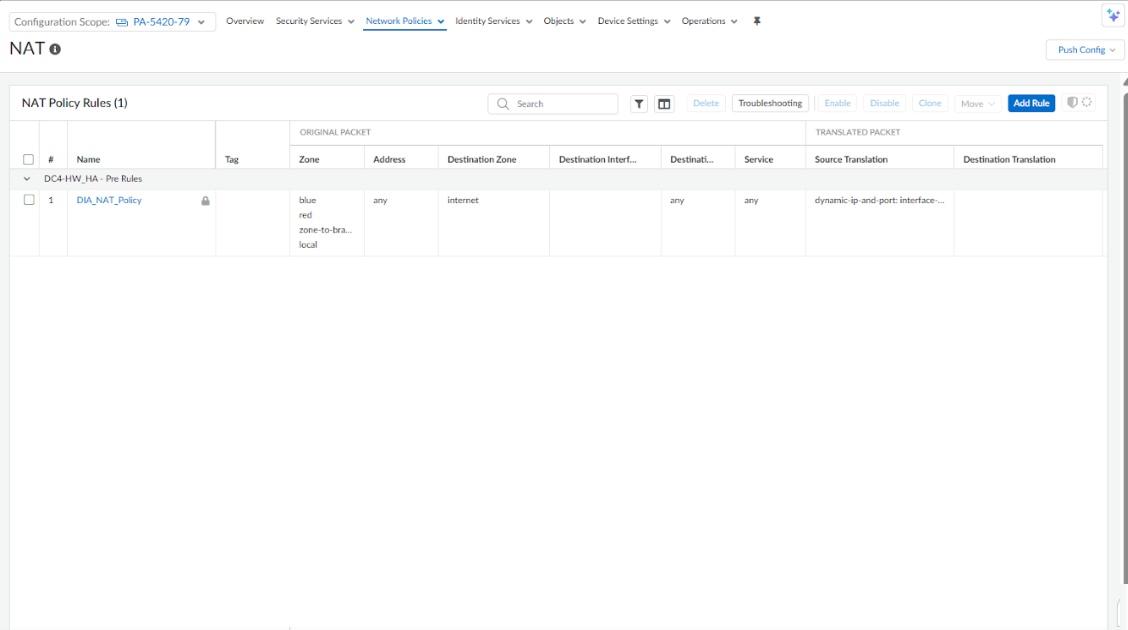 Add this NAT policy in Service and DC Groups.Push the NAT policy configuration to the NGFW.