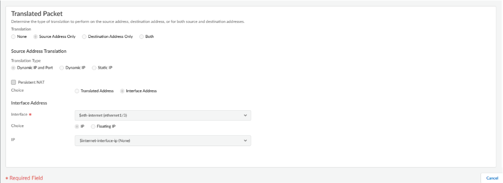 Configure Origin Packet Source address translation within the NAT policy.Select the translation type to be Dynamic IP and Port.Specify the Interface and IP address to be used for translation, typically the public-facing interface.