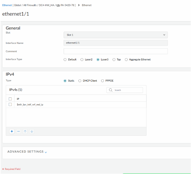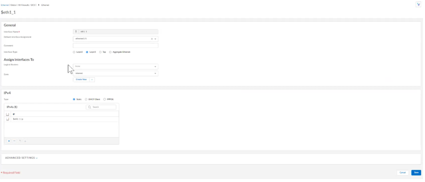 7. After the NGFW is assigned to a DC site, a logical router is orchestrated at the folder level where the NGFW resides. Navigate to the NGFW and configure the interfaces on the firewall for the public interface.