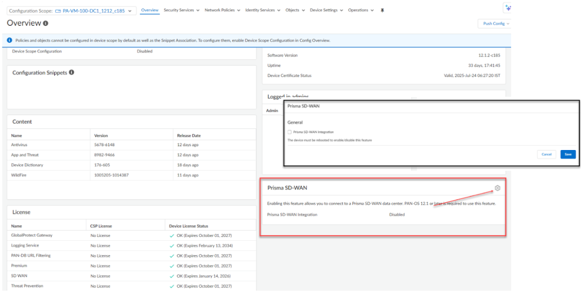 • Enable Prisma SD-WAN on NGFW and push config; device restarts.
