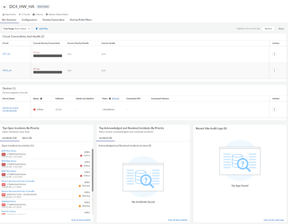 After the configuration is pushed successfully, you can view the overlay connection status. You can view any alarms or incidents reported on the device on the Incidents Prisma SD-WAN page.