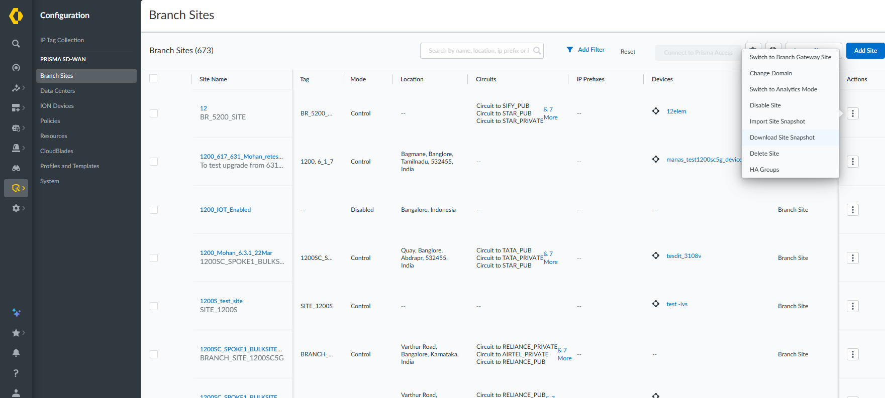 - Navigate to the Configuration Prisma SD-WANBranch Sites or Data Centers.Select a site and from the ellipsis menu, select Download Site Snapshot.