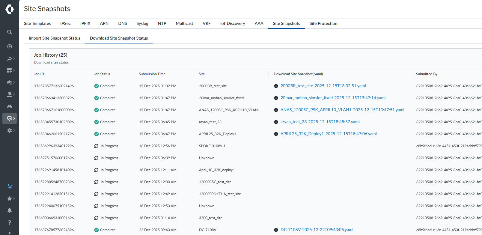 Site Snapshots history page includes Import Site Snapshot Status for a new site creation and Download Site Snapshot Status for snapshot yaml generation. Both Import and Export operations maintain distinct job statuses to indicate their progress and outcome. A warning status indicates that your site might have been created, but certain post-deployment actions, such as device assignment, may have failed. A failed status can occur due to configuration issues, interface problems, overlapping parameters, or conflicts. Proactive monitoring allows you to detect issues early and ensures your desired configuration state is achieved.- Navigate to ConfigurationProfiles and TemplatesSite Snapshots.This page reviews the history and status of all Site Snapshot import and download operations.Select the appropriate tab - Import Site Snapshot Status or Download Site Snapshot Status.Review the Status column for job results.A warning status could mean that your site was created, but device assignment failed. For failed or warning jobs, review the Status Description for troubleshooting.