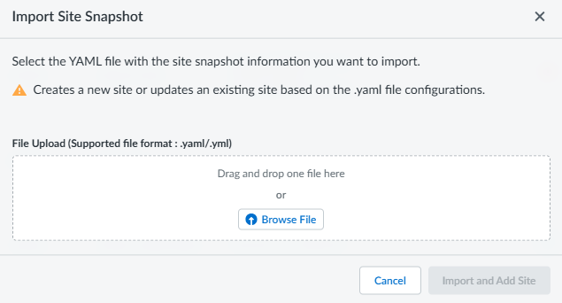 This allows you to deploy a new site using a pre-configured yaml file. To import, the yaml file must contain mandatory fields: name (Site Name), city, country, and software_version in the site address.