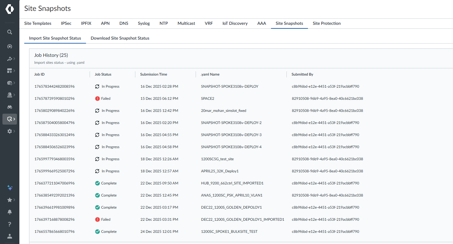 You cannot generate Site Snapshots for sites that have a device shell. Your site must have a physical device assigned or be completely blank. This ensures that you capture only fully configured or truly blank site states. If a site with the specified name already exists, the operation retries or redeploys the configuration, or a new deployment job is created.