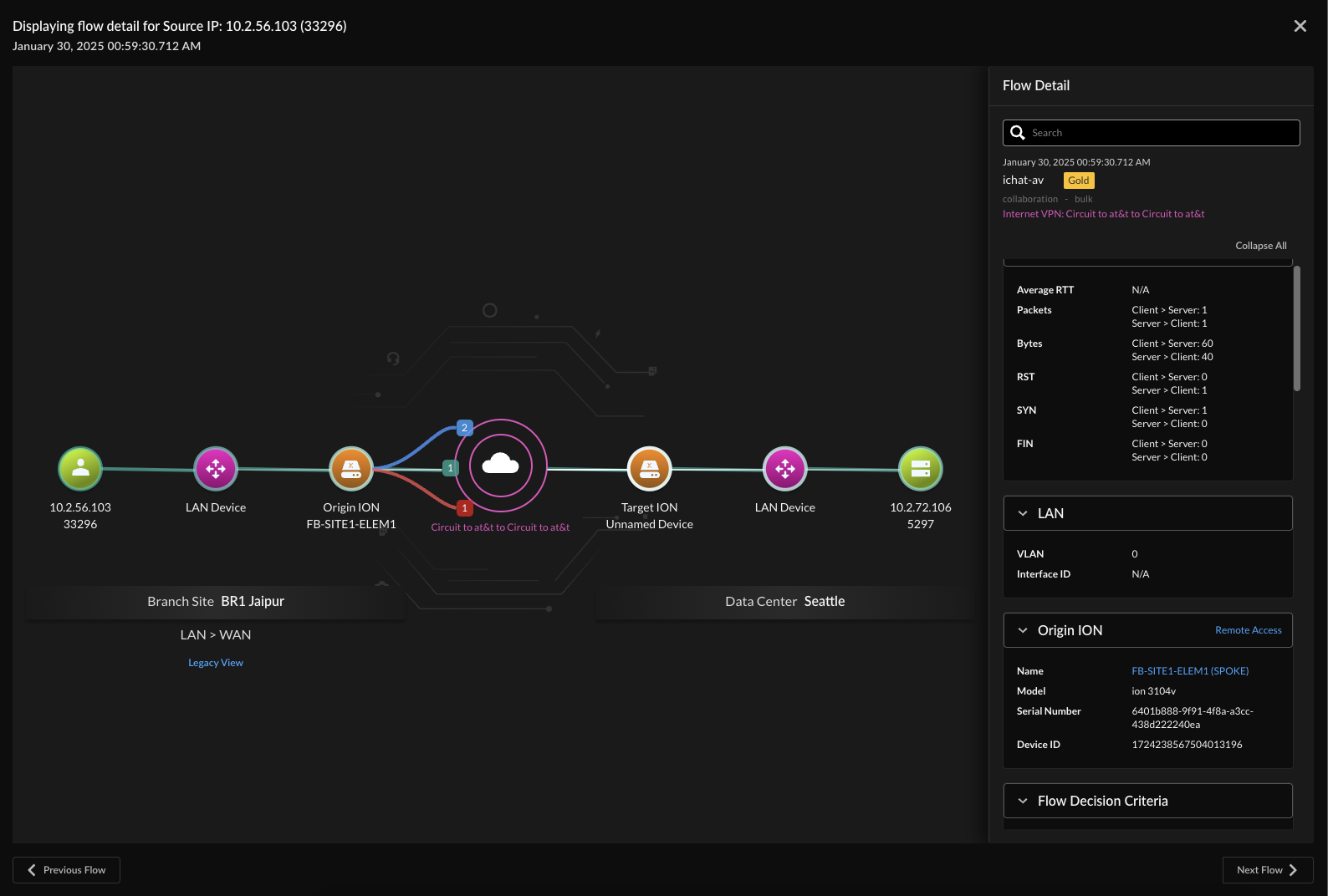 - Select ConfigurationPrisma SD-WAN Branch Sitesclick on branch Site Summary New Flows or Concurrent Flows widget View All flows and select a site to list all flows for the site.For Prisma SASE users, select Insights Prisma SASE Branch Sites Prisma SD-WAN Flows .The Flows chart displays the last 1000 flows (pagination with upto 1000 flows per page) for the selected time range, which can be up to one hour. You can filter flows for individual applications, devices, paths, and WANs. Sort the data by any of the columns displayed in the flow table.Click any flow to view comprehensive end-to-end flow sessions. Detailed information on the attributes of the flow enables you to visualize the entire path of a flow, from its origin site to its destination (target site), across multiple sites and network segments.