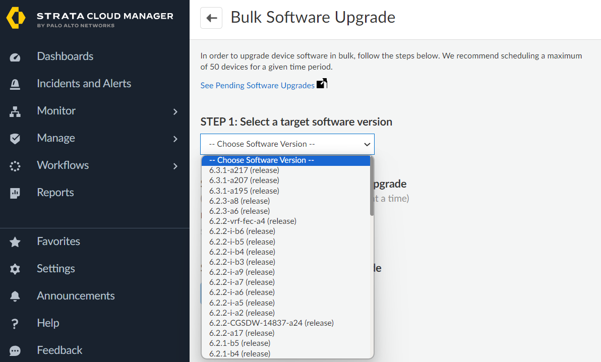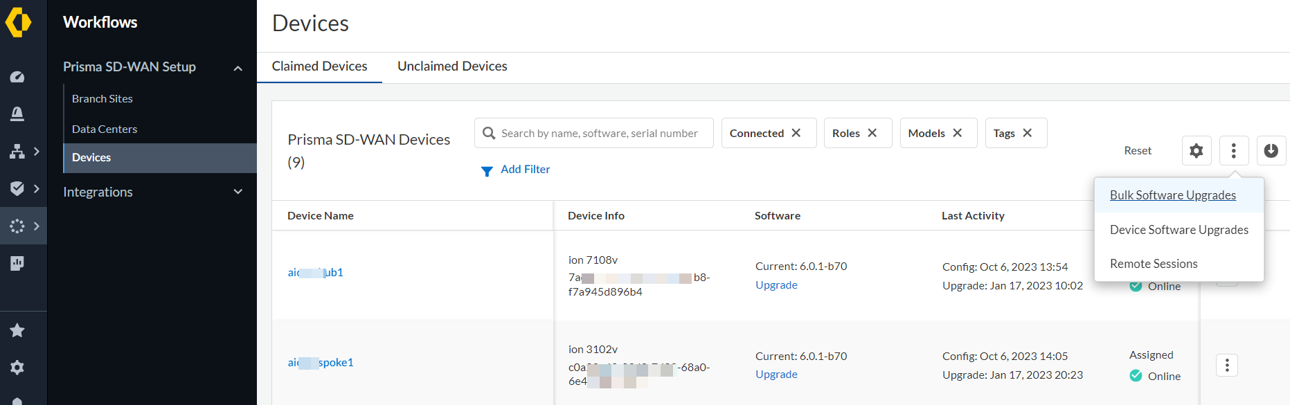 - Select ConfigurationPrisma SD-WANION DevicesClaimed.Select Bulk Software Upgrades from the ellipsis menu.