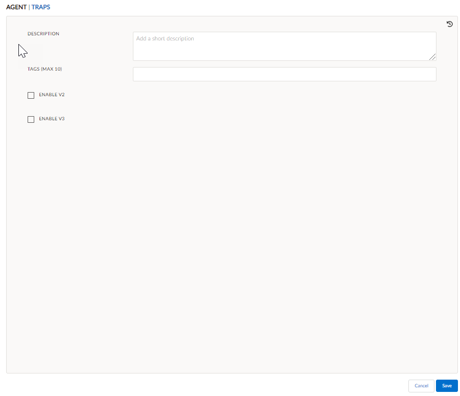 - Click the Agent tab.Enter a Description and add (Optional) Tags.Select Enable V2 or Enable V3.Both may be enabled, but at least one must be enabled.Select Enable V2 to configure Community.If V2 is enabled, community can be configured. If community is not configured, then public will be set as the default community.Select Enable V3 to configure the User. If V3 is enabled, use the Add User option to add a user and define the user attributes.Enter a Username (Optional) Engine ID to identify the device, and select a Security Level from the drop-down.The security level NOAUTH indicates that no authentication is required, AUTH indicates the authentication type, and Private indicates the security level.Auth Type may be MD5, SHA, or None. If you select an authentication type, enter an authentication phrase of 8 to 25 characters. Encryption Type may be AES, DES, or None. If you select an encryption type, enter an encryption phrase of 8 to 25 characters.