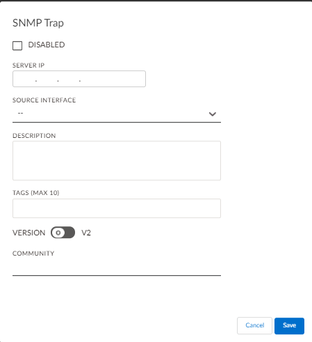 Click Save.Configure SNMP Traps.- Click on the Traps tab and select Add Trap.To enable SNMP Trap, make sure the Disabled option is unchecked.Enter the SNMP server or manager’s IP address.Select a Source Interface from the drop-down. You can now select associated VRF (global or custom).Enter a Description and add (Optional) Tags.Toggle Version to enable V2 for community or V3 for users.One of the options must be enabled at all times. V2 is enabled by default. A maximum of 16 unique servers may be configured per version (V2 and V3).If V2 is enabled, Community may be configured. If community is not configured, then public is set as the default community. If V3 is enabled, user attributes can be defined, including the Name, Engine ID, and the Security Level.Select Author Private as the security level and enter the authentication type and phrase.