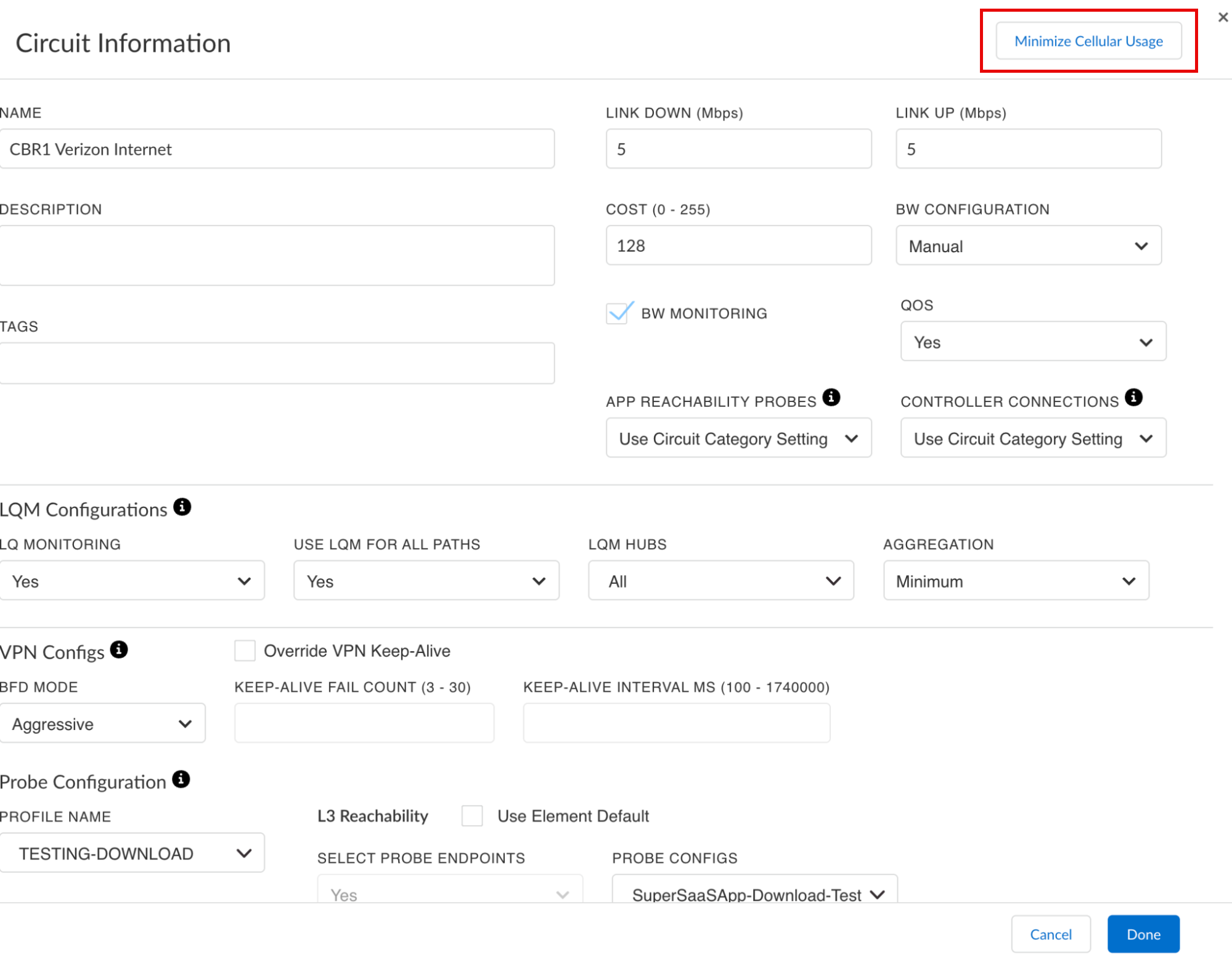 - Select ConfigurationPrisma SD-WANBranch SitesSelect a site.Select a site and in the Configuration tab, go to Internet CircuitsChange Circuits(Metered 3G/4G/LTE Circuit Category) CircuitEdit.Click the Minimize Cellular Usage button.