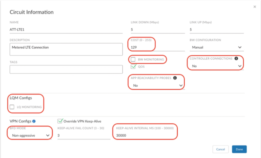 Modify the circuit category settings to minimize metered LTE usage.- Select ManageResourcesCircuit Categories.Edit the Metered 3G/4G/LTE circuit category.You can select any circuit category to modify for minimizing metered LTE usage but use the metered 3G/4G/LTE circuit category for optimum settings.In less common cases, you can use metered private links. For example, metered LTE links can be terminated into a private network versus the public internet. In this case, you can use a Private circuit category instead of a Public circuit category.Clear the Use For Controller Connections check box to minimize the amount of data sent over that path to the controller.Clear the Use For Application Reachability Probes check box to reduce the amount of non-user application traffic over metered circuits.This should ONLY be done if this circuit category is referenced as an L3 failure path in the path policy rule, as this will effectively ensure that the ION device does not react to layer 7 failures for application flows on this circuit.Set the Keep-Alive Interval to 600,000 ms.Configure a path policy rule to minimize metered LTE usage.