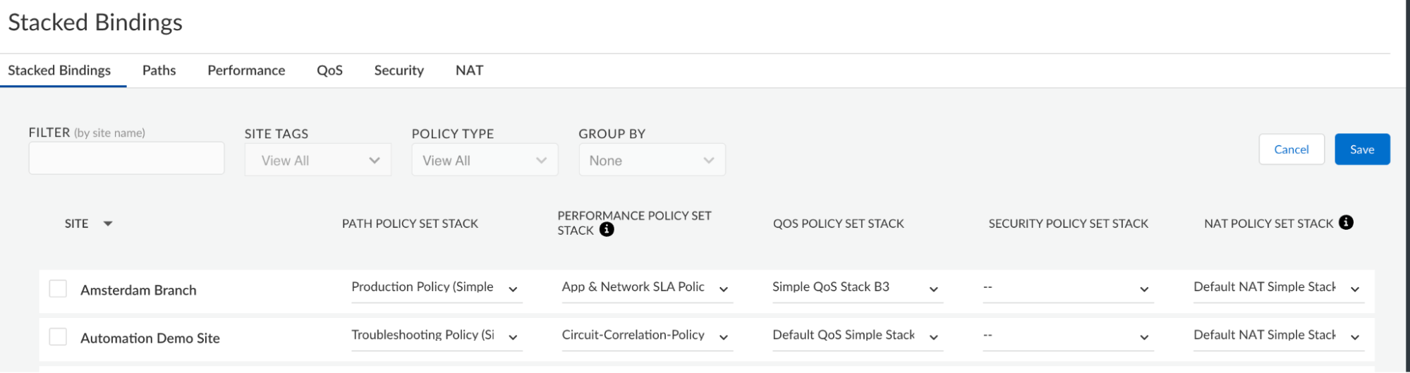 2. For a site, select a path policy set stack from the Path Policy Set Stack, Performance Policy Set Stack, QoS Policy Set Stack, and Security Policy Set Stack from the respective drop-downs and Save.