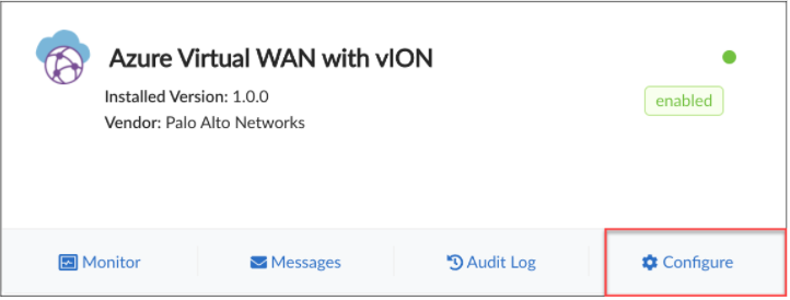 - In Strata Cloud Manager, go to ConfigurationPrisma SD-WANCloudBlades.Locate the Azure Virtual WAN with vIONand select Configure.