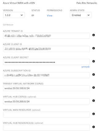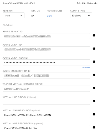 - TRANSIT VIRTUAL NETWORK CIDR: Provide comma-separated list of non-overlapping CIDRs for each region. The CIDR represents the private address space of the Virtual Network that hosts the Prisma SD-WAN vION instances and their associated resources in Azure. Prefix lengths of /16 up to /26 are supported. Format: <Azure Region Code>:<CIDR>. Example: westus:10.10.0.0/16.Enter information for TRANSIT VIRTUAL NETWORK CIDR if you have a brownfield or greenfield deployment.