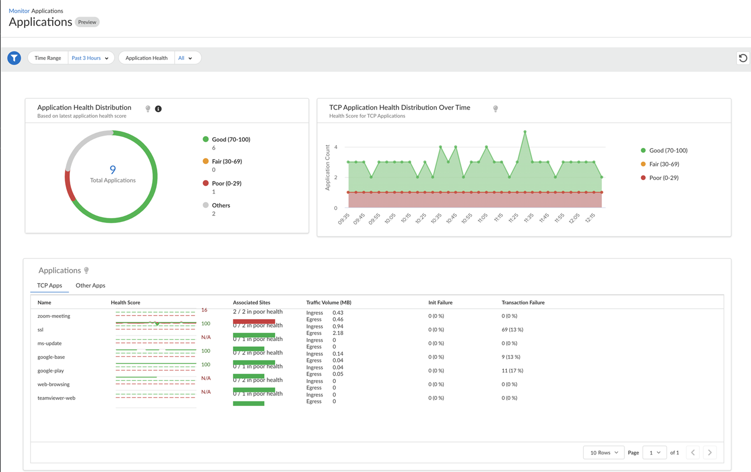 - TCP Application Health Distribution Over Time: The time series graph of application health distribution over time displays the good, fair, and poor applications for a given tenant. The time-series graph should be computed and refreshed based on the selected duration. For example, supported durations are 1 hour, 3 hours, one day, seven days, 30 days, and 90 days and the interval is 1 minute, 5 minutes, 1 hour, and one day, respectively.