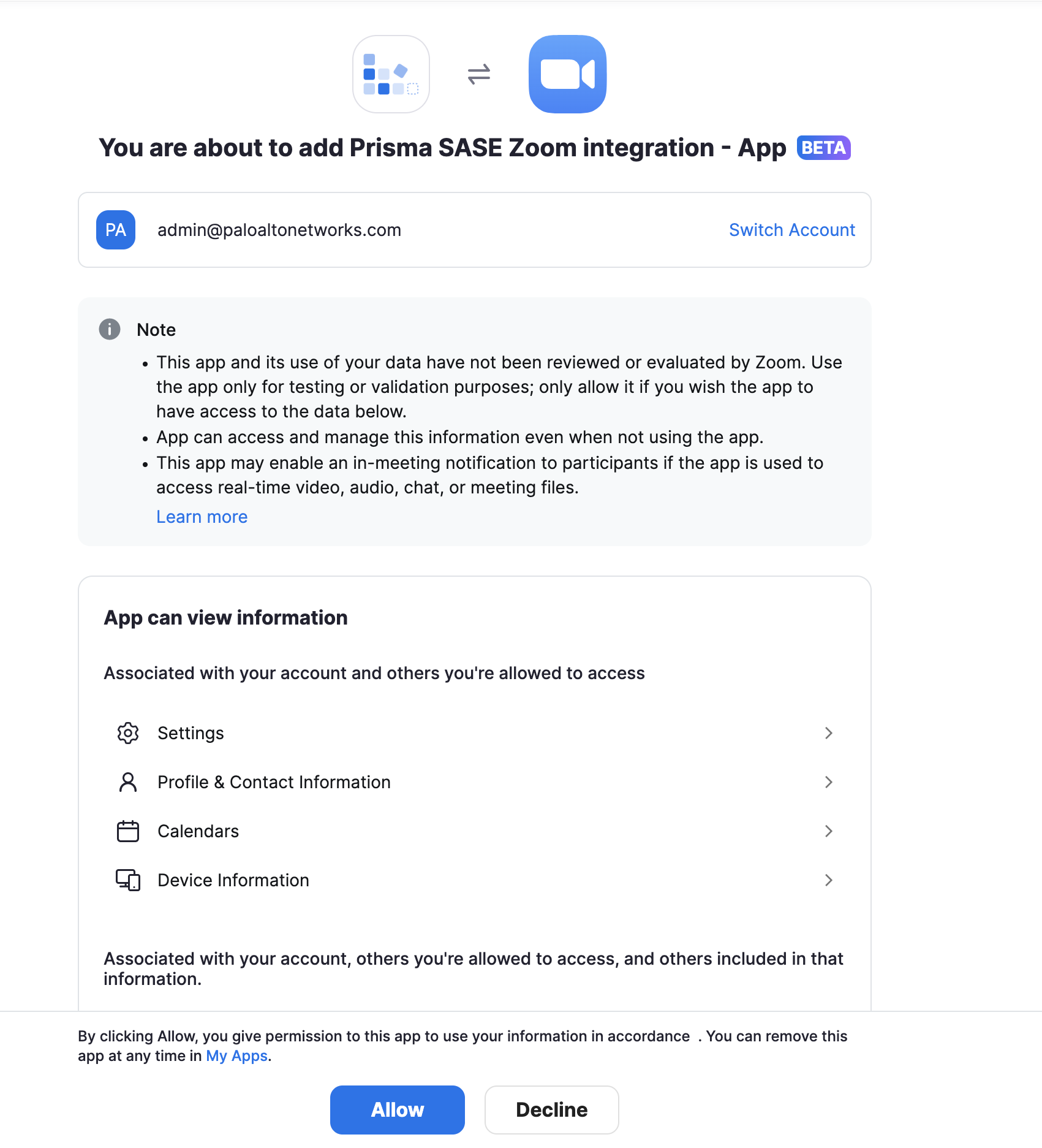 Select Allow to add access permissions of the Prisma SASE Zoom Integration app.