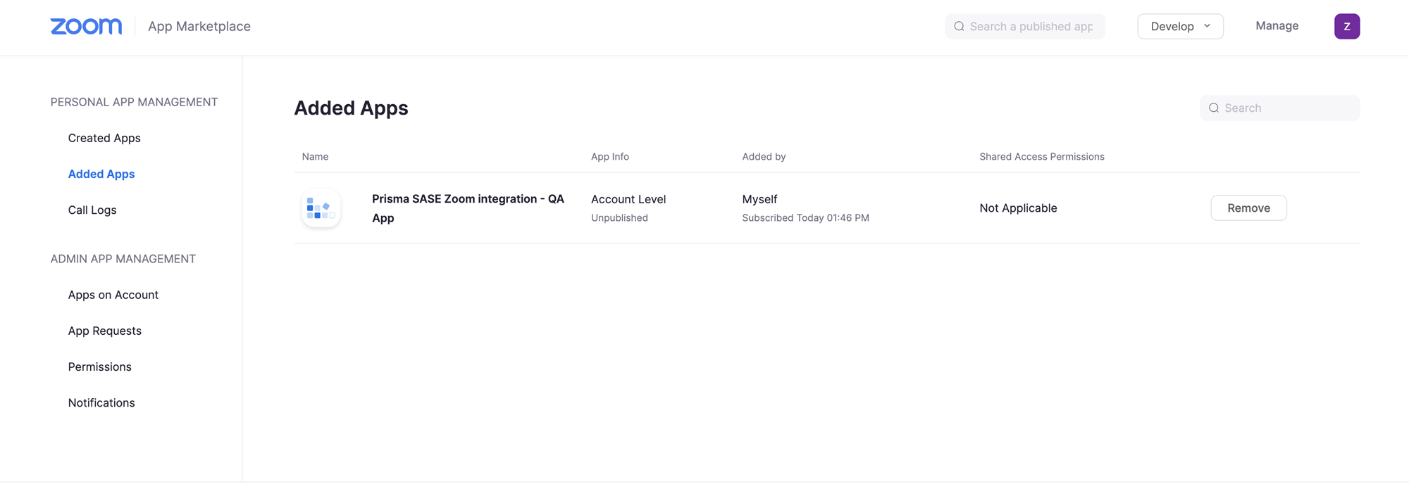 To verify if the CloudBlade is enabled, go to the Zoom marketplace to see if the Prisma SASE Zoom Integration app is published under Added Apps.