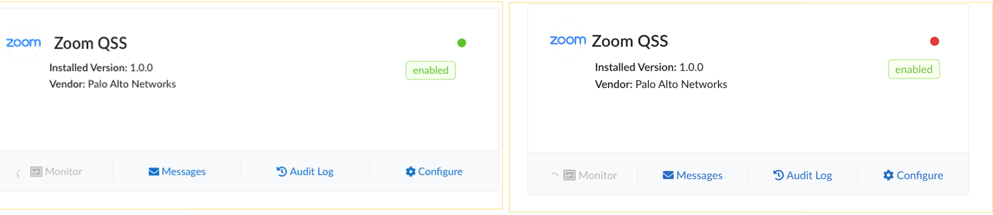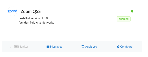 You will see a green indicator on the Zoom QSS CloudBlade tile upon successful authorization. A red indicator means the Zoom account is not authenticated properly, and needs to be re-authorized. When there is no indication, the CloudBlade is in a uninstalled state.