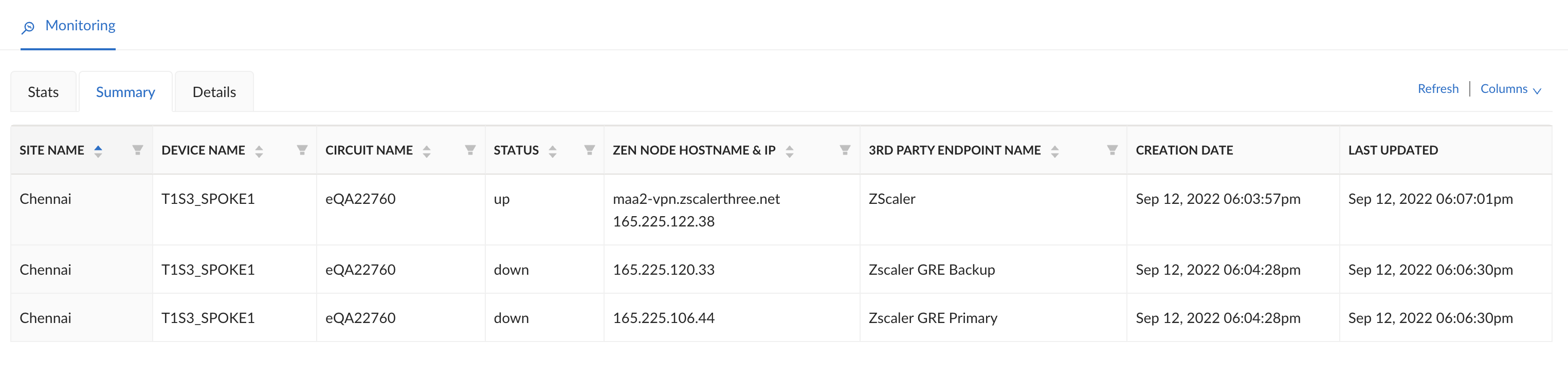 Select the Summary tab to see an overview of all the connected sites, ZEN node endpoints, and name of the third-party endpoints.
