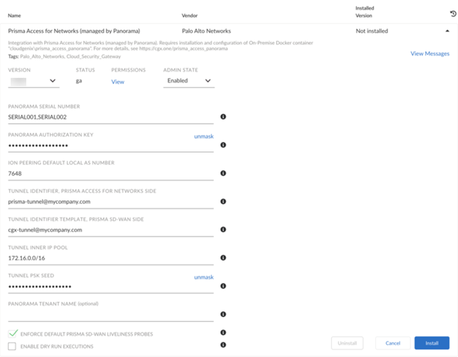 If you select and change the version of the CloudBlade, you must reenter all the configuration values for that particular CloudBlade version.In CloudBlade version 3.1.6, you must delete all existing tunnels before updating the sub-tenant name in the CloudBlade configuration to change an associated sub-tenant on Panorama used for the integration. The CloudBlade behavior is undefined if you change the tenant name without first clearing the existing tunnels. Modifying any values may cause all tunnels to be recreated if you change the tunnel CIDR.Integrate Panorama with Prisma SD-WAN CloudBlade