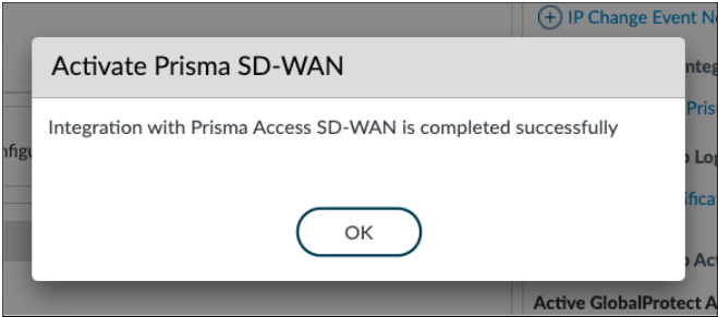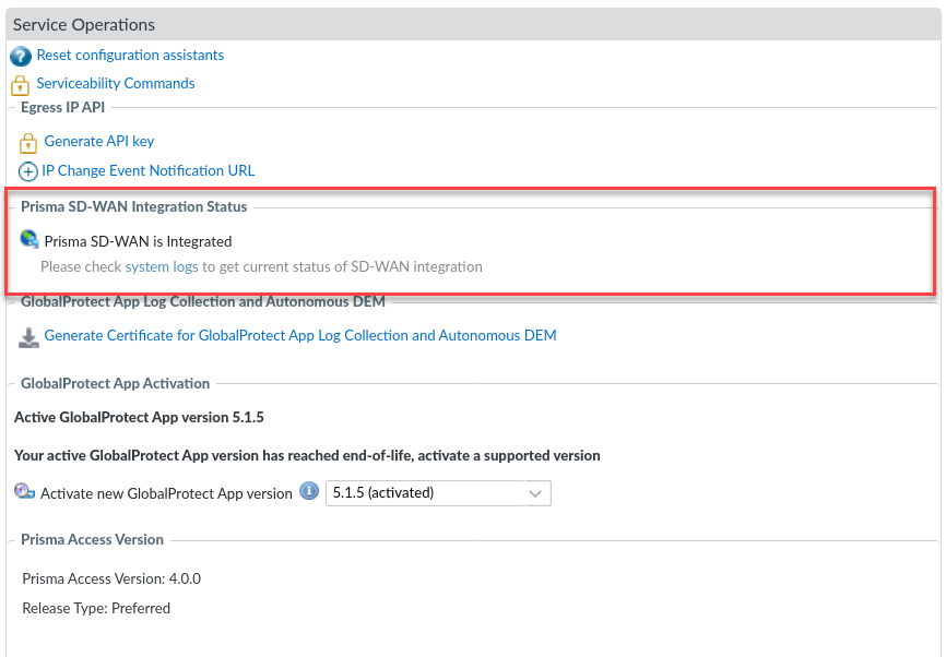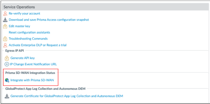 To complete the integration:- In the Cloud Service plugin for Prisma Access configuration, under Service SetupPrisma SD-WAN Integration Status, click the Integrate with Prisma SD-WAN link.