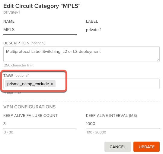 To accomplish this, the following tag can be applied globally or at the device level: prisma_ecmp_exclude