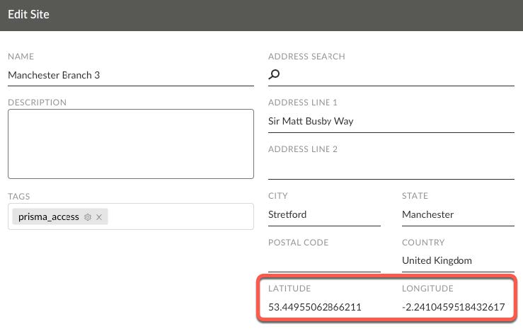 ECMP automatically detects the closest Prisma Access location for a branch to connect based on the Latitude and Longitude values entered in the Site Details for a branch.