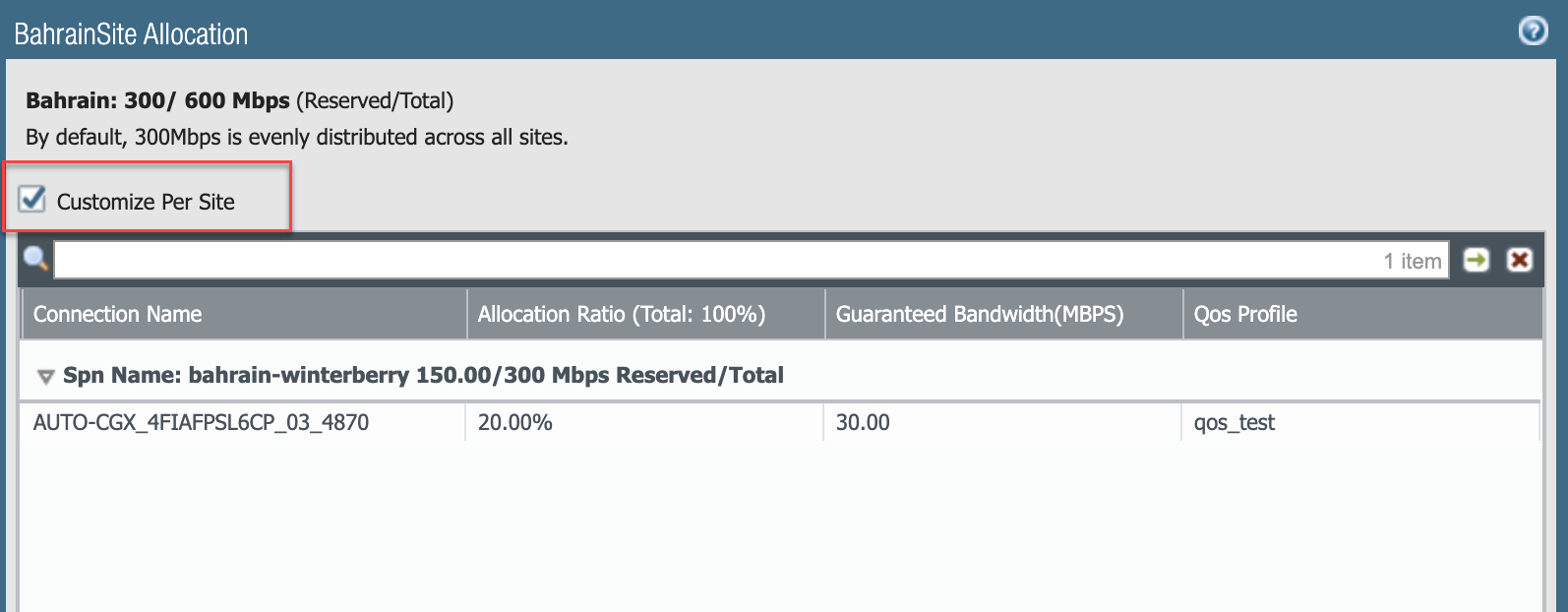 Check the Customize Per Site check box and click OK.Select Commit and Push to save the changes.In Prisma SD-WAN, navigate to the SiteInterfaces/Circuits and assign interface level tags in the following format.prisma_qos:<profile_name>:[0-100]The profile name for QoS will be the same name as the profile created in step 1.Interface/Circuit level tagging can be done for both ECMP and Non-ECMP enabled sites in Prisma SD-WAN.- Non-ECMP: Go to the site on Prisma SD-WAN where you wish to customize QoS and tag the interface or circuit. In the example shown below, the allocated bandwidth is 20%.