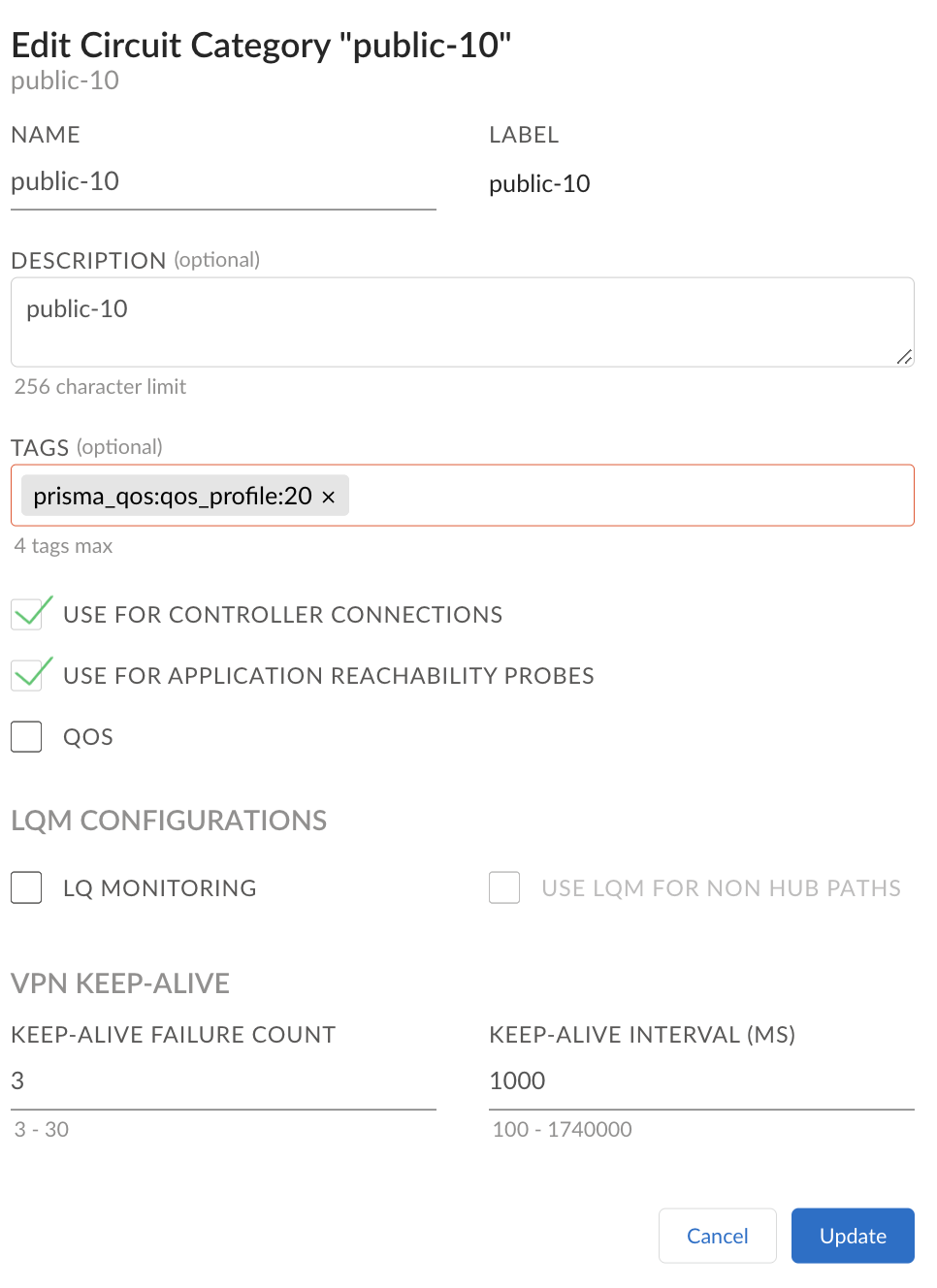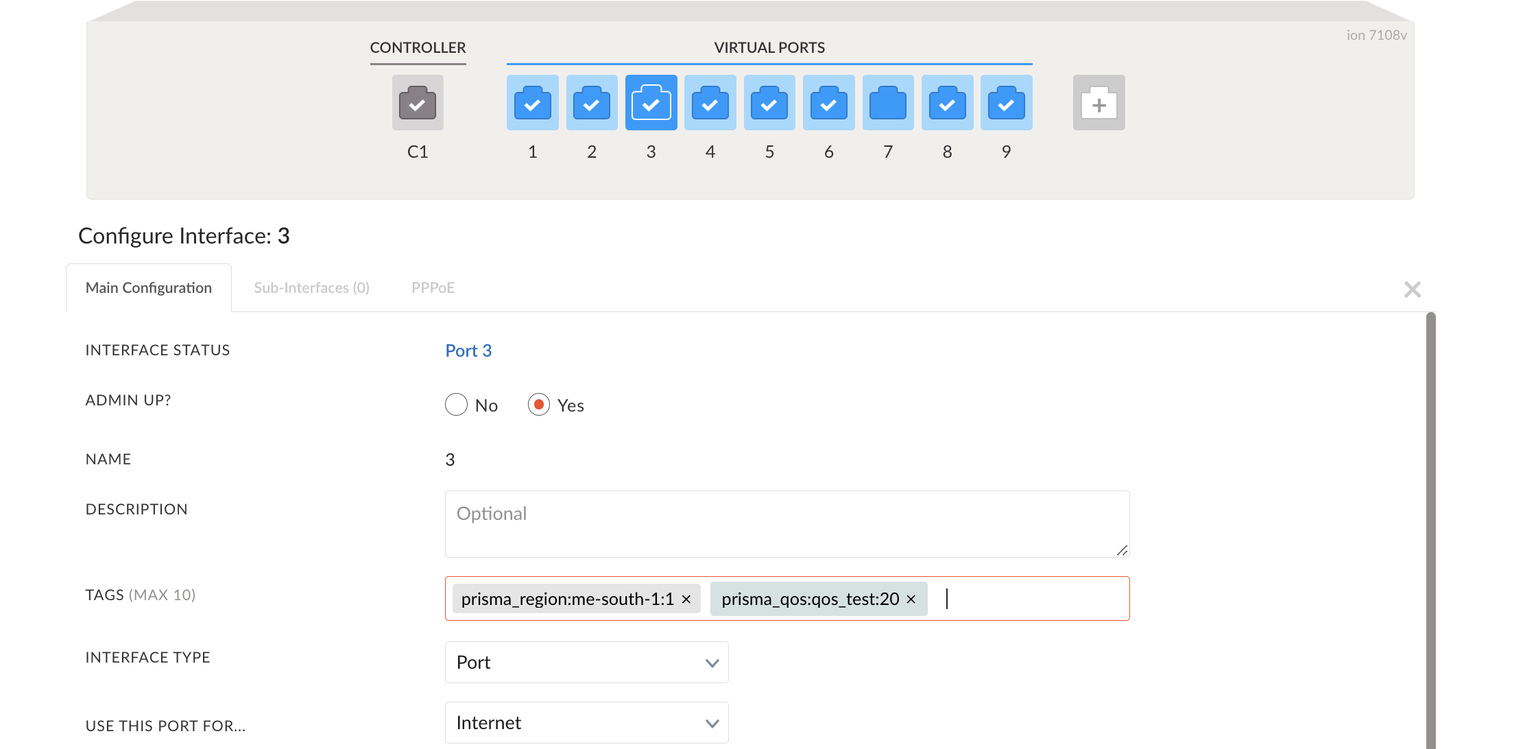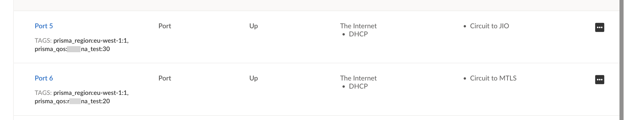 Select Save and Push your changes.In Prisma SD-WAN, navigate to the SiteInterfaces/Circuits and assign interface or circuit level tags in the following format.Format:<profile_name>:<qos_bandwidth>Example:prisma_qos:qos_test:20