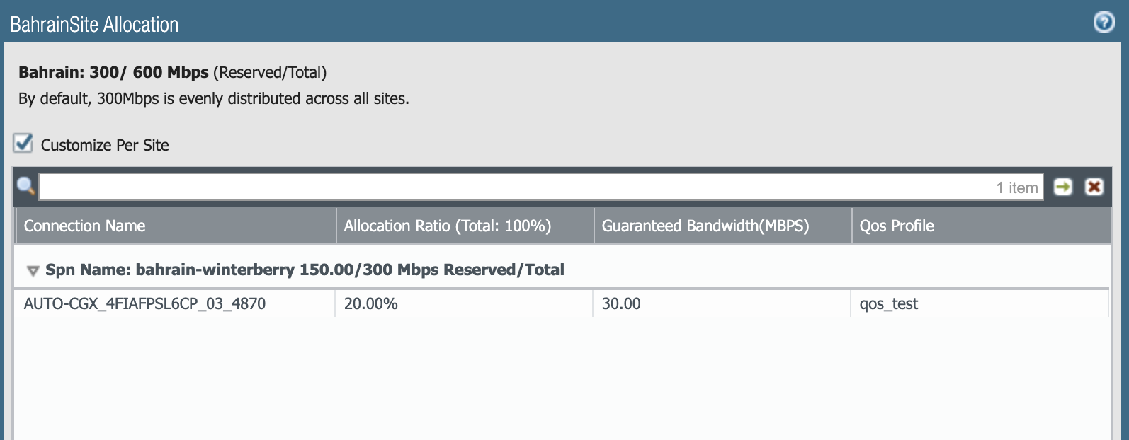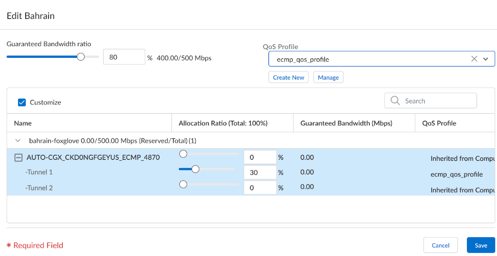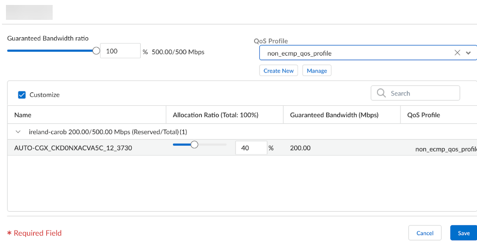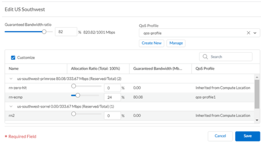 - Select the guaranteed bandwidth ratio, which is a ratio based on the entire allocated bandwidth for the compute location.For example, if you have allocated bandwidth of 1,001 Mbps for the US Southwest compute location, and you enter a guaranteed bandwidth ratio of 82%, the guaranteed bandwidth for that compute location is 820.82 Mbps.By default, each remote network is given a percentage equal to the number of connections. For example, given four connections in a compute location and a total guaranteed bandwidth of 820.82 Mbps, each location receives 25% of that bandwidth, which is 205.2 Mbps.Create New QoS Profile or Manage to edit an existing QoS profile.